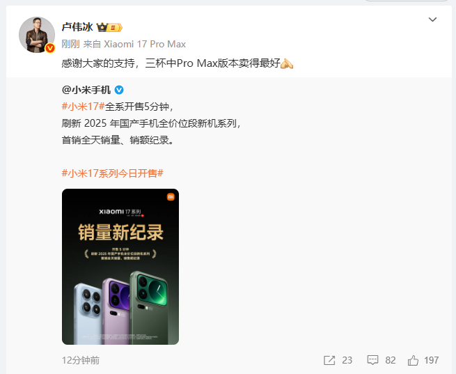 据小米手机官方微博,小米17全系开售5分钟,刷新 2025 年国产手机全价位段新机系列,首销全天销量、销额纪录。卢伟冰转发战报。